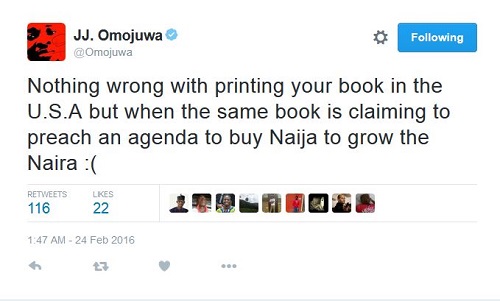 An observant Nigerian shared book on Twitter saying: ‘So, #BuyNaijaToGrowTheNaira advocate made his book in the USA.’